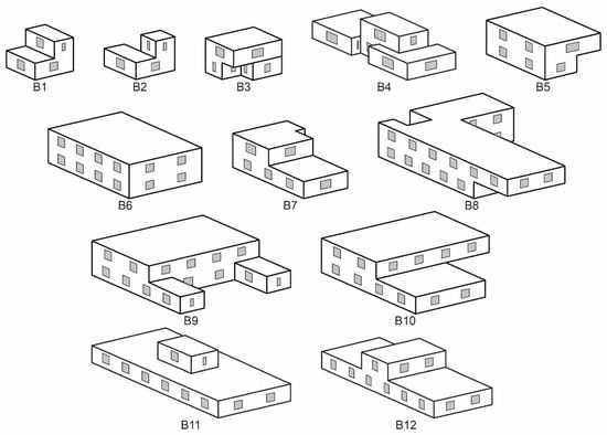The results of this study were based on simulations carried out with Energy Plus. The energy demand was calculated by Energy Plus with dynamic hourly simulation. A total of 12 different building typologies were modeled for accurate knowledge (see Figure 8). Consequently, as 12 typologies were used, and there are 66 climate zones and regulations of the various countries (including the new regulation of France from 2023), a total of 792 different simulations were conducted. Models were designed to include different building typologies, from single-family dwellings to multi-family buildings. These models were based on other existing research studies on the subject matter [56,57,58,59]. Moreover, these designs were made to be similar to buildings of the countries analyzed. A limitation of two floors was established due to the variations presented by some regulations in the thermal properties according to the number of floors (e.g., Argentina in the thermal transmittance of windows). The percentage of glazed surface was 15% in all the opaque surfaces of the models.