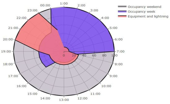 A general usage and load profile was used for all climate zones, thus making representative comparisons between the climate zones. Figure 9 shows the profiles used. The sensible load in weekends corresponding to 100% of occupancy was 2.15 W·m−2, and the latent load was 1.36 W·m−2. During the week, the sensible and the latent occupancy loads varied from 100% at night up to 0.54 W·m−2 and 0.34 W·m−2 (period between 08:00 to 15:00) and up to 1.08 W·m−2 and 0.68 W·m−2 (period between 16:00 to 23:00), respectively. The lighting and the equipment load varied throughout the day, being 100% (4.40 W·m−2) from 20:00–23:00. The number of air changes per hour was 0.69. All the models had a conventional natural gas boiler for heating with a coefficient of performance (COP) of 0.92 and a heat pump for cooling with an energy efficiency ratio (EER) of 2.00. Setpoint temperatures varied depending on the time of day (see Table 12). As the variations of latitude between South America and Europe cause a change in the winter and the summer months of the year, constant upper and lower limits were considered during all months of the year. Two aspects were therefore met: (i) the profile was valid both for South American and European countries, and it could also be used in climate regions with lower thermal oscillations throughout the year, such as some zones of Brazil; and (ii) the profile met those isolated cooling energy demands that could take place in winter seasons, such as in Spain (as some studies report) [61].