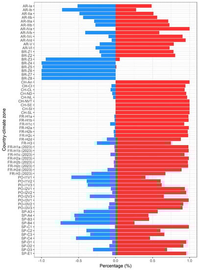 Firstly, the mean percentage contribution of each type of energy demand (heating and cooling) was analyzed in the different zones. This step was made before analyzing each climate zone in detail, as the aim was for the discussion to be based on the total energy demand to simplify its interpretation. Figure 10 represents the percentage contributions of each type of energy demand. Results highlighted the heterogeneity of the climate zones and the thermophysical characteristics analyzed in the various countries. The greatest contribution of energy demand was due to heating in most climate zones—countries such as Chile and France as well as certain climate zones of Argentina (IIa, IIb, IIIa, IIIb, IVa, IVb, IVc, IVd, V, and VI), Brazil (Z1 and Z2), Spain (A3, C1, C2, C3, D1, D2, D3, and E1), and Portugal (I1V2, I1V3, I2V1, I2V2, I2V3, I3V1, I3V2, and I3V3) presented percentages greater than 75%. However, there were some zones where the contribution of the cooling energy demand was the most important type of energy demand (greater than 50%): (i) zones Ia and Ib in Argentina; (ii) zones between Z3 and Z8 in Brazil; (iii) zone I1V1 in Portugal; and (iv) zones A4, B3, and B4 in Spain. Among these zones, it is worth stressing the high contribution of cooling energy demand in zones of Brazil due to their location in latitude near the equator, which implies that the thermal oscillation between the different seasons is low and temperatures are warmer.