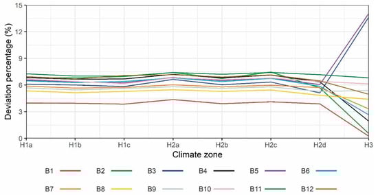 As for France, there were two limit values: (i) limit values for buildings designed and built before 1 January 2023 (see Table 13); and (ii) limit values for buildings designed and built after 1 January 2023 (see Table 14). This variation of limit values only took place in the opaque envelope elements. Regarding the results obtained, the zone and the configuration presenting the lowest total energy demand was zone H2a, with a percentage reduction between 7.08 and 23.41%. The next two zones with a lower total energy demand were zone H3 (with a percentage reduction between 7.09 and 16.91%) and zone H1a (with a deviation percentage between 1.89 and 10.50%), thus showing the favorable conditions of summer classification of type a of the French regulation, as they were those with the lowest energy demand. Regarding the zones with a greater total energy demand, zones with a summer classification of type c (H1c and H2c) were those obtaining the highest total energy demand values.