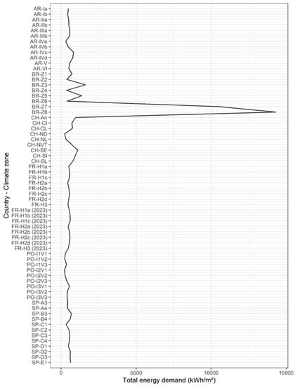 After analyzing the percentage contribution of each case study in the various climate zones, the results of the total energy demand obtained by each case study were analyzed. It is worth remembering that the case studies presented different characteristics of orientation and design, which varied the total energy demand of each. The aim was to analyze the effect of the thermal limitations on statal regulations with different designs of buildings.