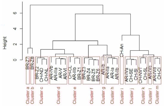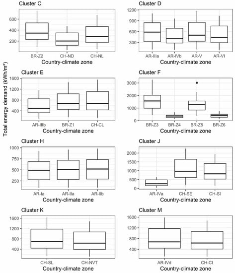 Finally, a comparative analysis between the results obtained among the climate zones presenting similarities was conducted. For this purpose, an independent cluster analysis was carried out for the climate zones of South America and Europe. A cluster analysis is a multivariant statistical technique that classifies a set of objects—similar objects are in the same conglomeration, and far objects are in different groups, giving as a result homogeneous k-groups [62]. The Ward method was used [63], which belongs to the agglomerative hierarchical methods, and the Euclidean distance was used as a distance measure [see Equation (1)]. The variables considered for each climate zone were the heating degrees-hours for base temperature of 20 and cooling degrees-hours for base temperature of 25.