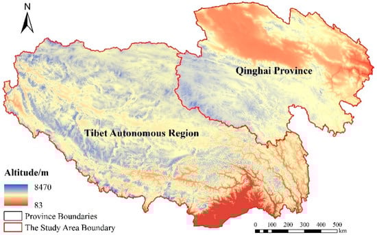 Tibet (78°25′–99°06′ E, 26°50′–36°53′ N) is located in the southwest of the Qinghai–Tibet Plateau. It covers about 1.23 × 1012 hm2 with a total population of 3.37 million. The average elevation is above 4000 m, with a range from 1000 m in the southeast to 5000 m in the northwest. The annual mean temperature is 2.8–11.9 °C and annual total precipitation is 74.8–901.5 mm [44]. There are many rare species in Tibet, such as the Tibetan antelope, yak, yew, and so on [45]. Tibet is abundant in natural resources, such as water, forests, and minerals.