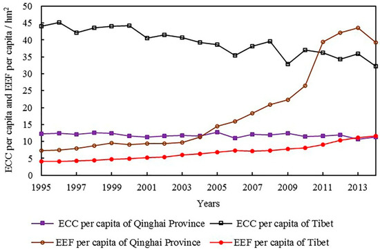 Generally, the ecc of both Qinghai and Tibet showed a downward trend from 1995 to 2014, but the eef showed an upward trend during this twenty-year period. The eef of Qinghai Province increased from 7.29 hm2 in 1995 to 39.9 hm2 in 2014, reaching the maximum value (43.63 hm2) in 2013 (Figure 2). The ecc of Qinghai decreased from 12.27 hm2 in 1995 to 11.36 hm2 in 2014. We can observe from Figure 2 that the eef exceeded the ecc since 2004, which reveals that Qinghai experienced an expanding emergy ecological deficit beginning in 2004.