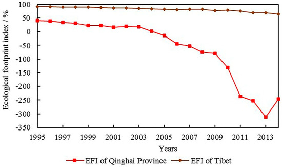 The EFI of Qinghai and Tibet declined from 1995 to 2014 (as shown in Figure 3). The EFI of Tibet decreased gradually during 1995–2004, dropping from 90.85% to 63.63%, which means that Tibet was still at a high level of sustainability. EFI of Qinghai fluctuated between 2005–2013, with values greater than zero from 1995 to 2004, which showed that emergy carrying capacity was sufficient to support the growth of regional emergy ecological footprint. However, EFI was less than zero from 2005, which indicated that emergy carrying capacity was insufficient to support the growth of regional emergy ecological footprint.
