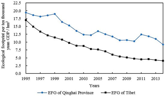 EFG of Qinghai and Tibet showed a downward trend in general from 1995 to 2014 (shown in Figure 4). It revealed that the resource utilization efficiency and the level of economic development of Qinghai and Tibet continuously improved. This result can also prove that both Qinghai and Tibet are devoted to upgrading industry structures, improving energy use efficiency, and increasing capital and technology investment in dealing with pollution. The EFG of Qinghai was much higher than that of Tibet, which indicates that the resource utilization efficiency of Qinghai was higher than Tibet.