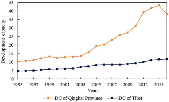 The DC of Qinghai increased from 1995 to 2014 (shown in Figure 5), reached a maximum of 43.43 hm2/cap in 2013 and declined to 38.17 hm2/cap in 2014. The annual increase rate of Qinghai’s DC (13.67%) is smaller than that of its EEF (22.37%). The DC of Tibet increased from 4.61 hm2/cap in 1995 to 11.69 hm2/cap in 2014, with an annual increase rate of 43.47%. This result indicates that the improvement of the DC in Qinghai and Tibet has mainly contributed to the increase in the EEF rather than the increase in the diversity of land types. Moreover, the decreasing rate of diversification of land-use types indicates that both Qinghai and Tibet attempted to balance the distribution among the six land categories from 1995 to 2014, but this distribution is still far away from equilibrium.