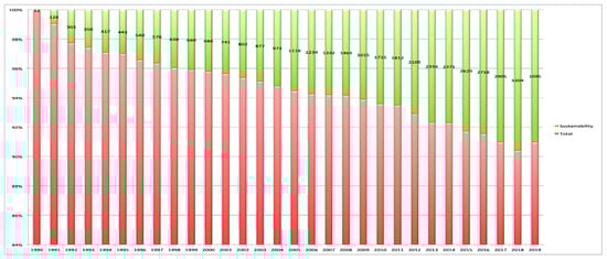 Year-by-year distribution of the publication literature on sustainability relative to all the literature of the selected journals (1990–2019).