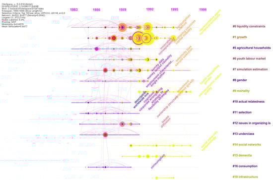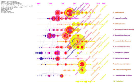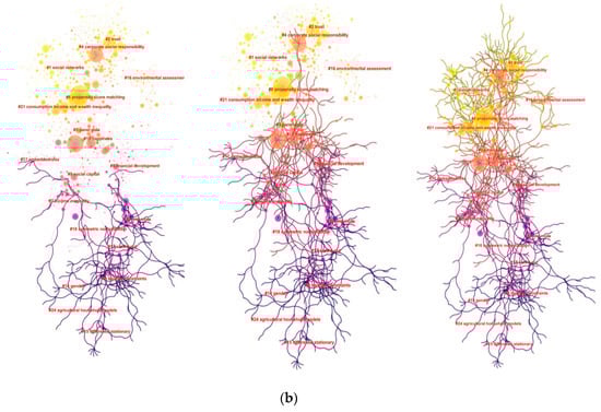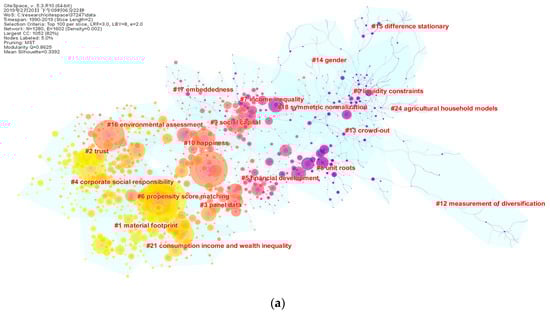 For example, as shown in Figure 3a, the purple-colored areas at the upper right quadrant, including the six labels (#0—liquidity constraints, #12—measurement of diversification, #13—crowd-out, #14—gender, #15—difference stationary, #24—agricultural household modles), represent earlier research hotspots. For instance, the #0—liquidity constraints topic, popular in 1990s, means the restrictions on the use of assets to finance needs for consumption or investment, which relates with consumption and income, playing an important role for macroeconomic outcomes. In the middle, the magenta-colored areas represent more recent research hotspots, including #5—financial development, #7—income inequity, #8—unit roots, #9—social capital, #10—happiness, and #17—embeddedness. The latest research topic hotspots are covered in the yellow areas, including #1—material footprint, #2—trust, #3—panel data, #4—corporate social responsibility, #6—propensity score matching, #16—environmental assessment, #21—consumption income and wealth inequality. A greater number of sudden points can be found in the magenta area and the yellow area, suggesting a reduced homogeneity in clusters and a proliferation of research topics. Such a developing process can also be clearly viewed by the Figure 3b, just like a process of mycelium cultivation.