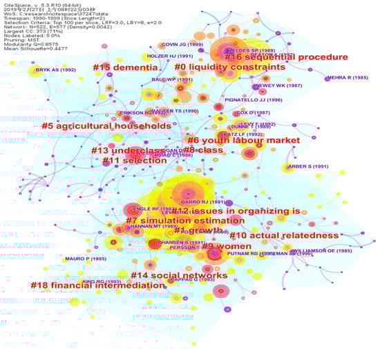 Figure 4 consists of two rather concentrated sections in its upper and lower parts, respectively. Occupying the upper part is the largest cluster in this period, focusing on household consumption and economic security as represented in “consumption”, “liquidity constraints”, and “permanent income” [51]. The next largest cluster is concerned with economic growth in macroeconomics [52], followed by the third largest cluster concentrating on topics such as job mobility, innovation, and labor markets, such as agriculture and the youth labor market [53]. They are clustered in the bottom of Figure 4. For this period, the research, represented in the publications in the ABS Academic Journal Guide 2018 prestigious journals, have mostly involved the economic factor as the single pillar of sustainability.