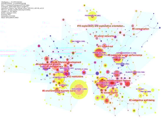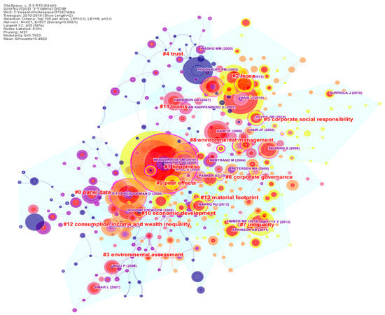 From the first 10-year period to the blue-colored areas of the second one, there is significant change in the topics that qualify as a citation burst, especially the social capital and various kinds of inequality that have taken up much attention of scholars. There were many more hotspots in Period II, indicating a time of transition. In the last 10-year period in our data, happiness has become a new research hotspot. Environmental assessment and environmental management (especially in supply chain management) have gained prominent positions. The topics of inequality repeatedly appear in multiple clusters (Clusters #3 and #8). The shift from economic to societal to environmental nearly perfectly affirms the “three pillars” framework of sustainability.