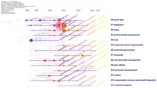 The duration, sustainability, and activeness for a cluster to remain interesting are shown in Table 6. For example, happiness research had remained active for 14 years, but this topic has become relatively quiet since 2015. In contrast, corporate governance, with a similar longevity of 14 active years, is still active, although its prime time was until 2017. Inequality and economic growth are evergreen research topics and this bibliometric analysis confirms that they will remain active as the cornerstones of sustainability. Corporate social responsibility (CSR) as a research topic became active in 2009 [71] and has remained active. Figure 10 presents a micro-targeted view of cluster #5, corporate social responsibility, which shows the evolution of this topic and the articles that the citation burst is associated with.