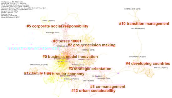 The core value of Sustainability journal is openness to diversity based on a variety of disciplinary lenses about sustainability. Here, we also map the 955 related articles in the journal from 2009 to 2019 and find some interesting points for reference, as shown in Figure 11 and Table 7. The topics with the orange color are closely interconnected with and transformed from the topics of the yellow color gradually. The business model innovation has been the most outstanding topic [72], followed by topics of circular economy [73] and group decision making. Sustainability in developing countries has been paid more attention and strategic orientation for the management in sustainability has been proposed. The classic topics like corporate responsibility and family firms are still developing. The OHSAS 18001 Certification Scheme, an occupational health and safety standard (OH&S) designed to enable organizations to control risks and improve performance in the area of OH&S, has been recently increasing in promotion. It is noticeable that these more specified topics extracted from the journal of Sustainability are same as the topics we refined from the past few decades, such as social responsibility, while also different from many topics, such as panel data, happiness, environmental assessment, and so on. These nonoverlapping topics can shed light on the readers and scholars of the potential extended research topics of business and management for sustainability in the journal.