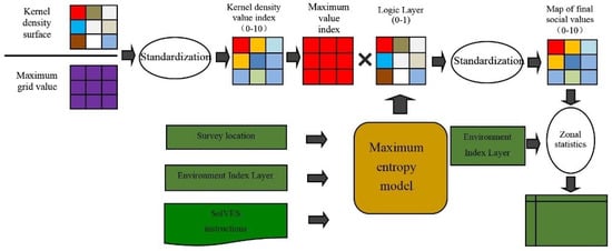 Cultural services are established under certain natural conditions and are a product that adapts to the natural environment. Cultural services generally refer to the nonmaterial benefits that humans obtain from the ecosystem [33,34]. The SoLVES (Social Values for Ecosystem Services) model is used to quantify cultural services, and is a typical representative model of cultural services evaluation. Cultural services, as the link between society and natural environment, can be effectively assessed to enhance the benefits of ecosystem services to humans [35]. The SoLVES model consists of a social value module for ecosystem service functions, a value mapping module and a value conversion mapping module. Each submodule is related to the others. By using the maximum entropy model and basic data, the final cultural service value map can be generated. The maximum entropy model is a model for measuring the geographical distribution of species based on its governing principle (Figure 2). The area with available data is transferred to the area where data are missing, based on the value conversion method to achieve quantitative assessment of the data for the entire region [36]. In this paper, five values of aesthetics, culture, history, entertainment and spirit are selected to evaluate the cultural services in the research area. The data used consist mainly of social survey questionnaires and environmental data, in which the environmental data include the altitude, slope, mountain shadow, distance from roads, distance from water bodies and type of land use, resulting in five value index maps. In the end, the final weight distribution and value index map of the research area are generated based on a score system of expert analysis. The contents of the questionnaire include entertainment, aesthetics, learning, cultural atmosphere, degree of economic development, degree of sustainable development, living environment and people’s well-being and so on. In order to ensure the scientific nature of the data, the questionnaire also includes a survey of people’s age, sex and education level, 836 questionnaires were sent out, including 783 valid ones.