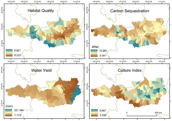 The SWAT (Soil and Water Assessment Tool) model adopted in this paper divides the Weihe River Basin (Guantian Section) into 157 subbasins according to the threshold of the minimum catchment area of the stator basin and specific conditions, such as the land use type and soil properties of the research area. Four types of ecosystem services, namely, carbon sequestration, water production, biodiversity and culture, are evaluated for the study area in 2015 (Figure 3) and analyzed at the subbasin scale.