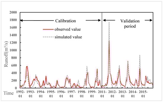 The carbon storage module of the InVEST model evaluates the total carbon stock of the entire region by totaling the carbon stocks of each carbon bank. The changes in land use type and area size are the main factors affecting the carbon sequestration capacity, and the carbon density values and distribution characteristics of carbon sequestration tend to be consistent. In 2015, the carbon sequestration range in the subbasin of the research area was 55.3–114.3 t/ha. The subbasins with high values of carbon sequestration per unit area are mostly located in the Qinling mountainous areas, and their land use types are dominated by forests. The green vegetation cover area can make greater use of the ground and underground space to maximize its carbon sequestration capacity. The amount of carbon sequestration per unit area of farmland is low, but the total amount is relatively high because of the large area of farmland in the research area. The subbasin located in the Guanzhong Plain area is an urban agglomeration area. Its carbon sequestration is relatively low, and the minimum value is approximately 55.3 t/ha. The carbon storage in areas with dense construction land is very limited. The selection of areas with a relatively weak carbon sequestration capacity, such as low-covered grasslands, as target areas for urban expansion, and the implementation of policies such as the conversion from farmland to forest or grassland, which could increase carbon sequestration, will contribute to the maintenance and growth of carbon stocks in the study area. Regarding the water yield in the study area in 2015, we fit the actual monthly runoff and simulation values from 1992 to 1999. The correlation coefficient R2 is 0.70, and the value is 0.67; the data from 2011 to 2015 are used for verification, and the correlation coefficient R2 is 0.90, and the value is 0.66 (Figure 4).