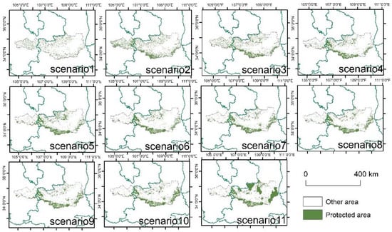 By multiplying the four weights and corresponding ecosystem services in the 11 scenarios, the OWA-calculated grids could be obtained for each scenario. To protect the ecosystem services efficiently, we designated 20% of the area as a protected area in the Weihe River Basin (Guantian Section). The calculated protection grids are shown in Figure 6.