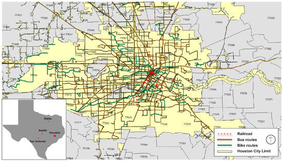 Place-based sociodemographic variables: To take into account the statistical impact of geographic disparities within a large-scale urban community (Houston City Limits was used to define urban communities in this paper; see Figure 2), we built a data set of place-based variables (i.e., housing characteristics, public transportation, and distance to the park) by ZIP code. Despite their imperfection, ZIP code data provide plausible boundaries for the local residential environment []. Based on the ZIP code recorded by each respondent, we created measures of housing characteristics using the 2013-2017 American Community Survey (ACS) at the ZIP code level (ZIP code tabulation area, or ZCTA). This variable was used because it is effective for indicating an overview of neighborhood characteristics []. To examine data for housing characteristics by ZIP code, we first determined that the highest percentage of the total population were living in single unit residences (57.90%). We then expressed the variable as a percentage of a total for each ZIP code. Next, to account for the potential effects of transportation accessibility to the park on community attachment, multiple shapefiles for the most common transportation modes to Discovery Green (i.e., rail stations, bus routes, and bike routes) were gathered via City of Houston GIS (COHGIS) and overlaid onto a file containing Houston’s City Limits (see Figure 2). We coded these modes from 0 (no access) to 3 (access to all). Finally, we used distance to the park as a variable in order to capture potential effects of residential location []. For this, we used information on distance between ZIP codes and Discovery Green (77010) to aggregate the data set at the ZIP code level by distance to the park (1 = 0–4.99 miles; 2 = 5–9.99 miles; 3 = 10–14.99 miles; 4 = more than 15 miles). These four measures were used as our place-based sociodemographic variables.