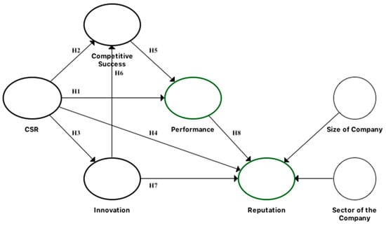 Although few studies have linked CSR and innovation, some theories and evidence have highlighted a relationship between the two strategies, confirming that the concepts are interdependent [38]. Larrieta-Rubín de Celis et al. [43] argue that CSR and innovation are closely related in a synergistic manner, contributing to sustainability, local socioeconomic development, and competitiveness. Gallardo-Vázquez and Sánchez-Hernández [44], and Sánchez-Hernández, Carvalho, and Paiva’s [45] work has further confirmed the existence of a direct, positive relationship between CSR and innovation through competitive success. In addition, other researchers, such as Rexhepi et al. [46], have found that innovation is stimulated by companies’ overall commitment to CSR.