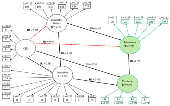 Various authors have pointed out that innovation has a close relationship with CSR and reputation [16,128]. Halme and Korpela [129] investigated SMEs’ environmentally and socially responsible innovations and concluded that companies are able to create these innovations by combining different resources, among them reputation. Along the same lines, recent research has found that new product designs and production processes and customer service improvements contribute to strengthening businesses’ reputation [130,131]. The present study’s seventh hypothesis reflected the above findings: