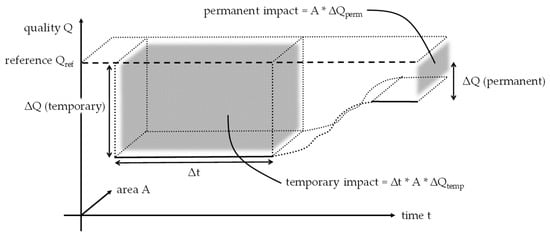 Quantification of land use impacts of a specific area over time, modified from [14,15].