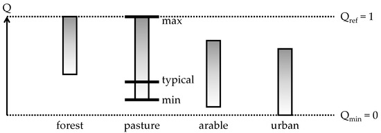 One consensus in LCA research is that beside climate change, pollution, unsustainable use of resources and invasive species, the main threat to biodiversity is the loss of habitat driven by the use of land for anthropogenic purposes [16]. Thus, biodiversity, including genetic, species and ecosystem diversity as defined by the Convention on Biological Diversity [1], can be one aspect that represents quality (Q) within the framework presented ahead (see Figure 1). Several life cycle impact assessment (LCIA) methods consider biodiversity as a so-called end point indicator. Nevertheless, there is no consensus on which indicators to use to represent impacts of land use on biodiversity in LCIA. In current research, two main directions can be distinguished: LCIA methods which link land use to species richness (positing: Q = species richness), and LCIA methods which link ecological conditions to impacts on biodiversity (positing: Q = function of ecological conditions). For the former approach, species richness of e.g., vascular plants is commonly used as an indicator, often amended with species richness of several animal taxa [8]. The latter approach is usually based on a set of quantifiable conditions, e.g., deadwood availability in forest ecosystems [17] or various sets of parameters relevant to each land use type [18]. Additionally, new developments also aim to assess the impacts on functional diversity (e.g., [19]). However, these are only applicable in very limited contexts to date. The LCIA method presented in this article calculates the impact on biodiversity based on the conditions that in all likelihood define the biodiversity on the patch of land under investigation.