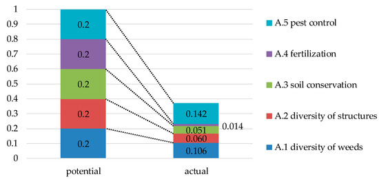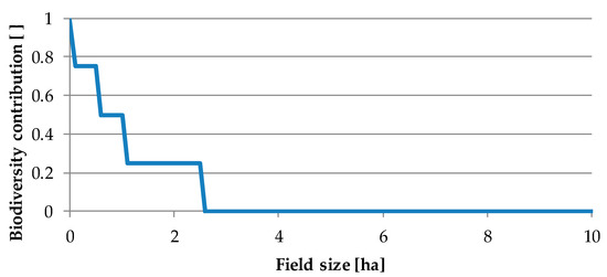 In the specific example of field size, thresholds between the hemeroby levels are derived from an Austrian directive [44]. The biodiversity value descending to zero at 2.25 ha (Figure 4) does not imply that a field larger than that has no biodiversity value. The biodiversity contribution is aggregated with the biodiversity contributions of other parameters (see below). The field may well have a biodiversity value greater than zero, but that value would be assigned based on contributions from other parameters.