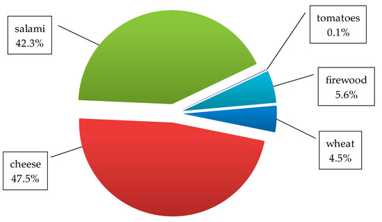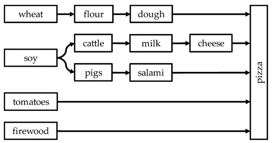 To illustrate the application of the method, we have chosen as an example a common consumer product that combines various components of land use—a classic pizza. In order to keep the example simple and illustrative, the recipe and the production process has strongly been reduced in complexity (see Figure 8). The exemplary pizza consists of a wheat dough with a base layer of strained tomatoes. We consider only two toppings, namely pork salami and grated dairy cheese. The pizza is baked in a traditional wood-fired oven fed with beech logs.