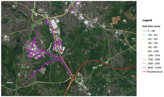Bradford is the UK’s fifth largest city, with 522,452 citizens living within the city boundaries, and has the youngest and fastest growing population of any city outside London [10]. The main connection of this large city with the national motorway network is via the , a spur of the motorway which is located south of Bradford. Considering these factors, it is not surprising that the road network to the south of Bradford is affected by intense freight vehicles traffic. In fact, in 2016 the was estimated to have an average daily flow of 5644 freight vehicles [11]. The flow is illustrated in map Figure 1, centring on the with the on the bottom right, with a green to red scale used to indicate the intensity of daily freight transport on the main roads.