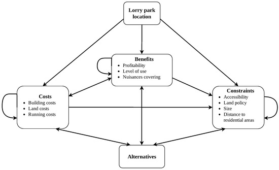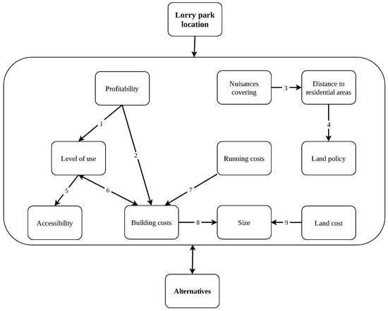 In Figure 2 the arrows between elements represent the dependency relations, while the arrows that connect the central area with other elements are considered as connected to each element of the delimited area. The set of identified dependency relationships are explained here in more detail, by associating each specific presented concept to the related arrows in the graph depicted in Figure 2 through the use of numerical labels. Profitability is largely influenced by the level of use of the facility: the higher the number of vehicles stopping overnight, the highest the economic sustainability of the overall parking system (1). A good Accessibility of the parking facility fosters its Level of use (5), as the former turns out to be a relevant element influencing lorry drivers when making their decision on whether or not to use a facility. Indeed, a substantial detour with respect to the their original route might be not convenient from the economic point of view, and even cause extended delays which might prevent lorry drivers from utilising the parking facility. Furthermore, in those extreme cases where the facility will not be accessible to heavy good vehicles (this is the case for locations connected by roads not suitable for HGV), the parking facility would not be usable at all by lorry drivers. This is also the reason for Accessibility being considered as a constraint in the clustering of elements depicted in Figure 3. By allowing increased economic investments (Building costs) it would be possible to provide better services to the drivers (including showers, hot meals and filling stations) who would be in turn more interested in the parking facility, securing a growth in the Level of use (6), and could be even willing to pay a higher fee, thus affecting overall the Profitability as well (2). On the other hand, this might lead to increased fixed and variable Running costs, particularly in those periods characterised by a low turn out (7). The Size of the selected location for installing a lorry parking facility affects both the Building Costs (8) and the Land costs (9), which increase as the size of the location grows. A major analysis factor for the choice of the appropriate location is the extent to which the effects of installing a lorry parking facility in a given location are spread over the relevant geographic area (Nuisances covering), thus enabling a sufficient coverage on those spots interested by the social issues already presented and discussed in Section 2. The latter needs to be counterbalanced with the location being concurrently far enough from the residential areas. Indeed, a facility directly located within the areas affected by the nuisances would be certainly effective in solving those issues strictly related to inappropriate parking by heavy goods vehicles, but at the same time would possibly produce different nuisances affecting residential areas due to increased traffic of those HGV headed to the parking facility (Distance to residential areas). Such a complex spatial relationship is represented by arrow (3), where the influence of the latter element on the former is captured. Finally, arrow (4) is devoted to account for the impact of the Land policy element on the Distance to residential areas one. Indeed, the suitability of a given area as a feasible alternative for siting a lorry parking, whilst respecting all constraints on the distance from residential areas, is affected in turn by the intended use of all the areas close to the candidate location, as in the future these might be allocated for residential development.