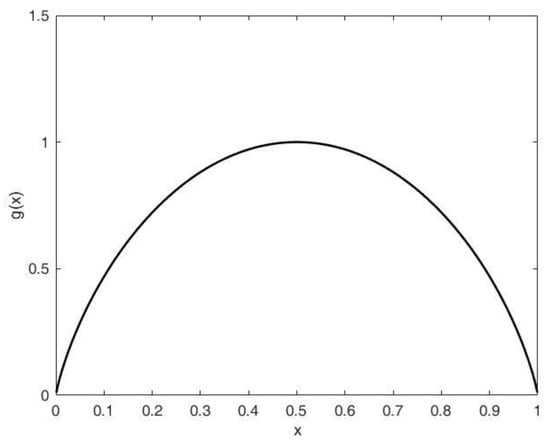 Thus, . It is obvious that when , when . Therefore, if , then is an increasing function with respect to ; if , then is a decreasing function with respect to . Furthermore, one can get that if and only if , if and only if . The graphical representation of is shown in Figure 1.