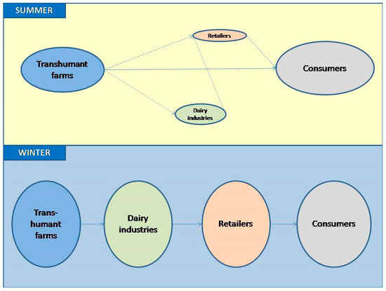Transhumance is the annual circular movement of livestock between winter and summer rangelands [1,2,3,4,5,6]. Flocks leave lowlands in spring and spend 4–6 months grazing in natural mountain rangelands, in order to avoid high summer temperatures [7,8]. In particular, sheep and goat transhumance constitutes a system with multiple actors with complex interactions at all links of the supply chain (SC) until products reach consumers. It is also a specific type of agro-pastoral (pasture-based) systems, thus it shares many common characteristics with them [9]. Sheep and goat transhumance is typical for Mediterranean settings, for instance in France (Alps and Pyrenees), Spain and Italy, while there is also transhumance in the Balkans (Bulgaria, Albania, North Macedonia) and in Turkey (mainly for meat) [9]. In the Greek setting, it is still practiced throughout the country [10,11], as it pertains to the climate conditions and geography of its mountainous, disadvantaged and marginal areas [12] and it is the activity that has kept many rural areas alive, while its cultural heritage has been a factor shaping their socio-economic development trajectories [13]. Nowadays, there are 3051 transhumant flocks in Greece, which rear approximately 1.1 million sheep and goats (2011) (about 7.5% of the sheep and goat population). More information about the structure of transhumance are available in [10].
