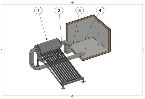 The experimental set consisted of four main component parts: first, a sauna test chamber; second, an evacuated tube solar collector; third, a temperature monitoring system; and finally, a ducting system to transport the air. The test chamber was constructed from a plywood board, 15 mm in thickness, with a 2 × 2 square bar and a 2-inch-thick insulating material. The solar collector used evacuated tube technology to gather heat, and a manifold was built using a ventilation duct to transport the heated air from the inside of the evacuated tubes to the test chamber. The ducting system used a centrifugal fan to force air into the system; thermal insulation was applied to the ducts to avoid the loss of thermal energy. Finally, the data acquisition used 14 DS18B20 temperature sensors from the Dallas semiconductor connected to an Arduino UNO board; the sensors were positioned in specific locations according to Figure 1 below.