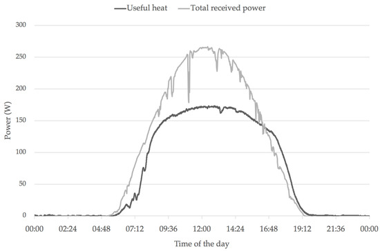 To test the amount of useful heat that the solar collector can give to the air, various tests were conducted. The primary source of data was the DS18B20 thermal sensors installed on the inside of the test equipment. Also, a Campbell Scientific CMP11 Pyranometer was used to monitor solar irradiance and was positioned on a horizontal surface to measure the Global Horizontal Irradiance (GHI). The solar collector was placed on a horizontal plane with the intention of using the GHI data in the calculations. The following figures show the results from two different all-day-long tests: The first graph represents the data gathered from an almost completely clear day with occasional small clouds that correspond to sudden drops in the irradiance value in Figure 2; the second graph shows data from a completely cloudless day, which is indicated by the smoothness of the received power curve presented in Figure 3.
