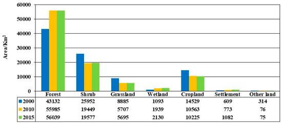 The land cover changes can be summarized as a continuous decrease in cropland, shrub, grassland, and other land and a significant increase in forest, wetland, and settlement, from 2000 to 2015 (Figure 2). Forest is the main land cover type in the study area. From 2000 to 2010, the area increased by 12,853.2 km2, whereas from 2010 to 2015, it showed a slight decrease of approximately 129.9 km2. Cropland showed a considerable reduction of 3966.2 km2 from 14,529.2 km2 in 2000 to 10,563.0 km2 in 2010 and then decreased slowly to 10,196.7 km2 in 2015. Settlement increased continuously from 608.8 km2 in 2000 to 1077.5 km2 in 2015. Wetland approximately doubled from 1092.9 km2 in 2000 to 2118.9 km2 in 2015. Other land, shrub, and grassland all showed significant reductions from 2000 to 2010 and changed slightly from 2010 to 2015. The area of other land types decreased obviously from 293.3 km2 in 2000 to 74.4 km2 in 2010 and then increased to 74.6 km2 in 2015. Shrub reduced considerably by 6503 km2 from 2000 to 2010 and increased slightly by 51.5 km2 from 2010 to 2015. Grassland decreased from 8884.9 km2 in 2000 to 5707.1 km2 in 2010, continually decreased to 5668.8 km2 in 2015 and showed a slight reduction of 38.3 km2 from 2010 to 2015. The overall accuracies are 89.6% in 2000, 87.2% in 2010, and 84.4% in 2015, whereas the kappa statistics (K) are 87.5% in 2000, 83.8% in 2010, and 80.7% in 2015 (Table 2).