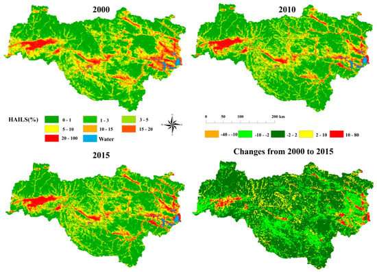 The results of the statistical analysis of phosphate and nitrogen fertilizer are shown in Figure 5. The linear regressive equation showed a positive tendency rate of both phosphate (297.1) and nitrogen (1169.8), which indicated an increasing upward trend. The HAILS values for the Shiyan District are shown in Table 5. From 2000 to 2010, HAILS values below 20% showed a decreasing trend, while high values (>20%) showed an obvious increase, which is associated with the use of chemical fertilizer.