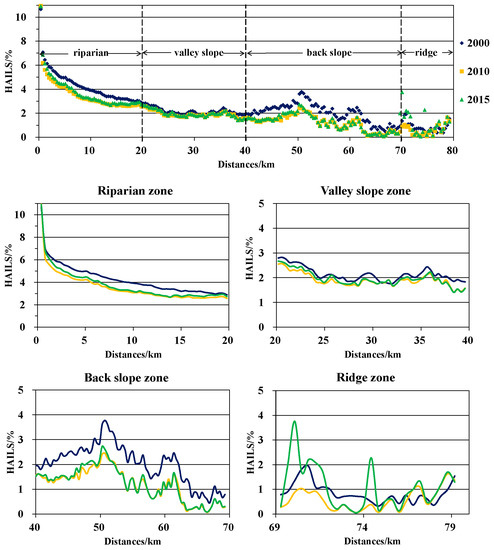 The variations of the HAILS in the four zones indicate that different management and development practices are needed. On the basis of the flow length distance, the HAILS index in the valley slope zone and back slope zone both decreased from 2000 to 2015. The valley slope zone is unsuitable for cultivation due to topographic limitations and the back slope zone is usually well protected by governmental policies, however, in the riparian zone, which is located close to water, the HAILS was between 11% and 2.5%, and from 2010 to 2015, the HAILS values increased, particularly within 7 km, and the increment was from 0.68% to 0.05%. Thus, the riparian zone can be considered a sensitive region for water resource protection.