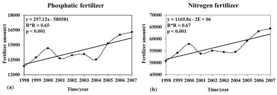 The Shiyan District, where the Danjiangkou reservoir is located, was chosen as an example for analyzing the relationship between the HAILS and chemical fertilizer. The amount of utilized chemical fertilizers, including phosphate and nitrogen fertilizer, was collected from the yearbooks from 1998 to 2007. Based on the fertilizer data, we used the linear regressive equation to predict the fertilizer usage trend [41,50,51].
