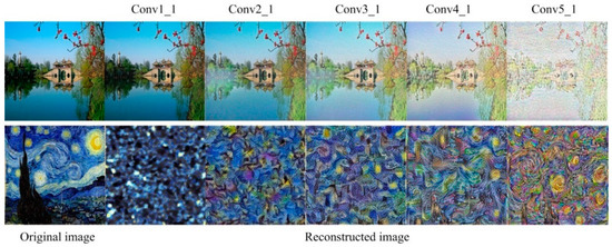 Since the features extracted by each layer of the VGG19 have multiple channels and cannot be directly visualized, we adopt the gradient descent algorithm to reconstruct the original image according to the features extracted by the different layer of the VGG19. The reconstructed images are initialized with Gaussian noise and then we put the initialized images into the VGG19. Then the extracted features are compared in the same layer and their loss are calculated. Next, the loss is back propagated to the reconstructed image and the reconstructed image is updated according to the gradient. When reconstructing the content image, we directly use the extracted features to calculate the loss, as shown in Formula (1).