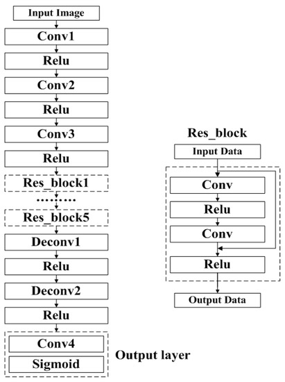 The style transfer network is stacked by multiple convolution layers, residual blocks, and deconvolution layers. The convolution layers and deconvolution layers adopt short stride for down sampling and up sampling, respectively. Specifically, the style transfer network is composed of four convolution layers, five residual blocks, and two deconvolution layers. Besides the output layer, each convolution or deconvolution layer is followed by a Relu activation layer. The residua block is firstly represented by He et al. [1] in 2016. After two liner transformations, the input data and its initial value is added through a “shortcut” and then the added value is inputted to the Relu activation layers. The whole structure of the style transfer network is shown as Figure 5.