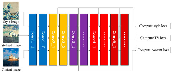 The input of the loss network contains three parts, the style image, the stylized image generated by the style transform network, and the content image. The loss network adopts the first few layers of the VGG19 to extract the features of images and its structure and workflow is shown as Figure 6.