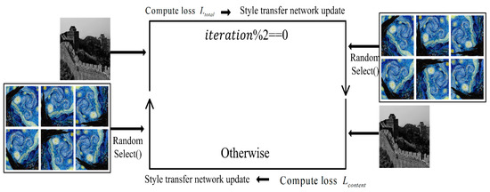 In order to preserve as much content information as possible, we use a cross training method by rotationally adopting different loss function. When the num of iteration is even, we adopt the original total loss as loss function, otherwise, the content loss will be chosen as the loss function. The loss function can be defined as Formula (11).