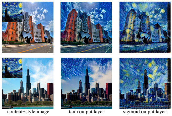 In our proposed algorithm, the output layer of the style transfer network can adopt tanh or sigmoid as its activation function. When adopting tanh as the activation function, the final output will adopt Formula (12).