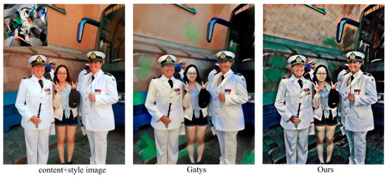 Sometimes, characters are contained in the content image and commonly, we expect those characters can preserve their original features rather than be rendered. In order to have an evaluation of the presented algorithm in terms of characters rendering, we compare it with the classic neural style transfer. Both two algorithms use the same content and style image with 1024 × 1024 pixels. Classic neural style transfer iterates only 500 times to preserve more features of characters and our presented algorithm still iterates 100 epochs for fully training. The experiment result is shown as Figure 11. As we can clearly see from Figure 11, that both two algorithms achieve a good performance in stylization. However, the classic neural style transfer algorithm stylizes the characters the same as the background which results in the facial features, contours, etc., of the characters become blurred and distorted. This can be explained as that classic neural style transfer adopts the optimization method to convert the original image to the stylized image. Therefore, the network will treat each pixel in the picture indiscriminately, making the content image close to the style image. While in our presented algorithm, the trained deep neural network will recognize the characters in the image and separate them from the background. Thus, the characters still keep complete features and clear outlines.
