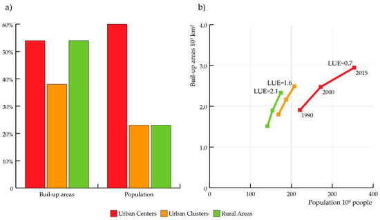 | Built-Up Areas (103 km2) | Population (106 People) | LUE | Relative Change 1990–2015 | ||||||||