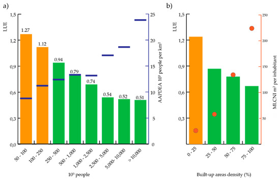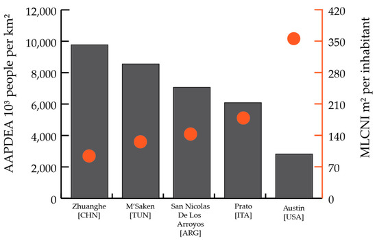 | Urban Centre | MLCNI (m2 inhabitants) | AAPDEA (inhabitants per km2) | Built-Up Area Change | Population Change |