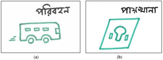 While building trust is foundational to community interaction, initiating design research warrants specific focus on and familiarity with socio-cultural and communicative aspects. Particularly when cultural participants were experiencing linguistic barriers and exhibited deference effects, socio-political marginalization posed additional challenges. Oftentimes, verbal-only conversations would fall short and fail to fully capture and represent the complexities of indigenous realities and practices. In response, with help and guidance from local communities, I gradually co-created an interviewing approach—ILGI (Iconic Legisigns Guided Interviewing) (details of the approach are discussed elsewhere) to meaningfully interact with the communities. By ensuring inclusivity, flexibility, access, and discursive control of participants over interview processes, ILGI approach sought to give “some degree of power back to the subjects” (p. 92) [46]. In the process, I used handmade cards with line-drawn images (guided and approved by as well as meaningful to local communities) to initiate conversations and conduct interviews (Figure 1). The visuals not only guided interaction processes, but also helped to communicate (as well as register) the discussion topics to less literate participants better; moreover, combinations of cards/topics yielded more specific and nuanced discussion about situated issues. In addition, involvement of community members in handling and debriefing the topics/cards helped the community to own and control (to a large extent) the interaction process. In addition, the approach helped the research process in observing evaluating and prioritizing local issues and thereby facilitating the design decision-making process. Inclusive engagements of the community members (i.e., in multiple sessions) enriched the interaction process and helped to define design problems in a collective and informed way.