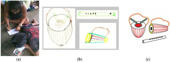 (a) Community drawing session; (b) Image of “culture” drawn by the villagers; (c) Image redrawn using computer.