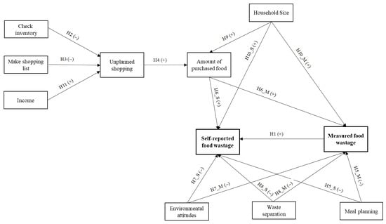 We developed a conceptual model that combined seven exogenous variables—checking food inventory, making a shopping list, meal planning, environmental attitudes, source separation of waste, household size, and income—and four endogenous variables—unplanned shopping, the amount of purchased food, self-reported, and measured food wastage.