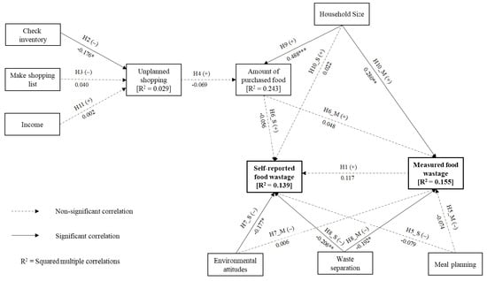 The correlations among the endogenous and exogenous variables are shown in Table 3. It demonstrates that self-reported food wastage is positively correlated (rp = 0.18, p < 0.05) with measured food wastage, though according to Colton [80], any coefficient values lower than 0.25 should be interpreted as no correlation. Results also show a positive association between household size and measured food wastage, negative associations between waste separation and both self-reported and measured wastage, and between environmental attitudes and self-reported food wastage. A relatively weak negative relation between making a shopping list and self-reported food wastage was also observed. Moreover, a weak and positive relationship exists between the amount of purchased food and measured food wastage. No other direct relations between food wastage and the other variables were found.